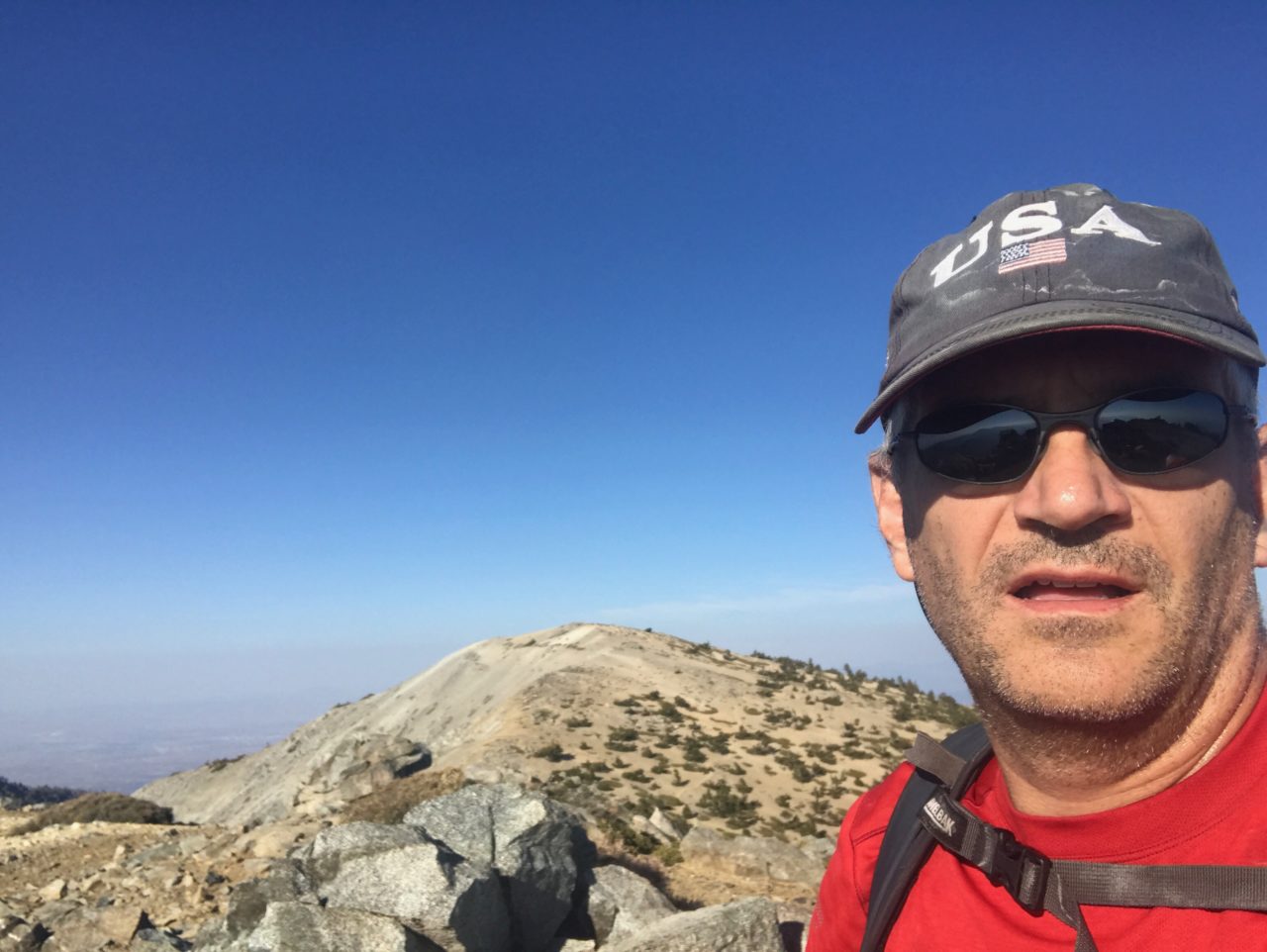 I got up just after 4 so I could eat a good breakfast and get to the trailhead at sunrise. I saw an acquaintance at the parking lot at the Ranger Station in Baldy Village, but she said my route was too difficult and was going to stick with the 6,000′ climb up Bear Canyon and then going to come down the ski lift. So I was on my own starting just a few minutes after sunrise. First came the 1.7 mile hike along Mt. Baldy Rd to the Icehouse Trailhead, then I took the Chapman Trail, because I just needed to add another 1.7 miles to make this even more difficult! It was beautiful, as usual, and the spring was flowing and the sunrise filling the canyon was refreshing. I still felt good. I got to Icehouse Saddle and started over to Kelly Camp, but decided that the trail would be too long/slow, so I decided to follow the tracks of the local Bighorn sheep, straight up a ravine to the ridge. It turns out that Bighorn sheep don’t make switchbacks and can go up hills that are significantly steeper than I’m normally comfortable with. Nevertheless, I kept going and cut off about 2 miles of nice gently sloping trail by hiking up this ravine filled with loose rock and deadfall that would be PERFECT for snakes to inhabit. I carefully picked my way through the downed trees and found the ridge trail. There were a few hikers at Bighorn. One woman is an avid hiker and said that she and her gf were going to do rim-to-rim-to-rim in October at about the same time as me.