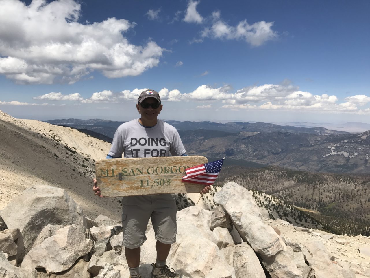 Team GD spent the night at Barton flats to be near trail head for an early start. We were on the trail at 6:20am. A ½ mile up the trail after crossing the stream (not much runoff) this hike starts. Steep and a real gut check. After about a mile it levels to more of a normal grade. If we were not in shape, we would have never recovered. The rest of this hike is doable but long. Gliding over saddles and in trees. The final push over the moonscape of rocks to get to the summit was not bad because you can see what you are trying for. 5 ½ hours to the top – 8.8mi after lunch, photos and time to think about my friend Greg (who we dedicated the 6 pack of peaks challenge to). We start back down stopping at High camp to pump water. Hard on the legs and knees that last section before crossing the stream. Total = 17.6 miles in 10 hours, 5,606 vertical ascent and max Pos. Gradient = 25.3% (STEEP). This is to date the longest, highest and furthest I have hiked in 1 day. I think not bad for a bunch of 50+ somethings….