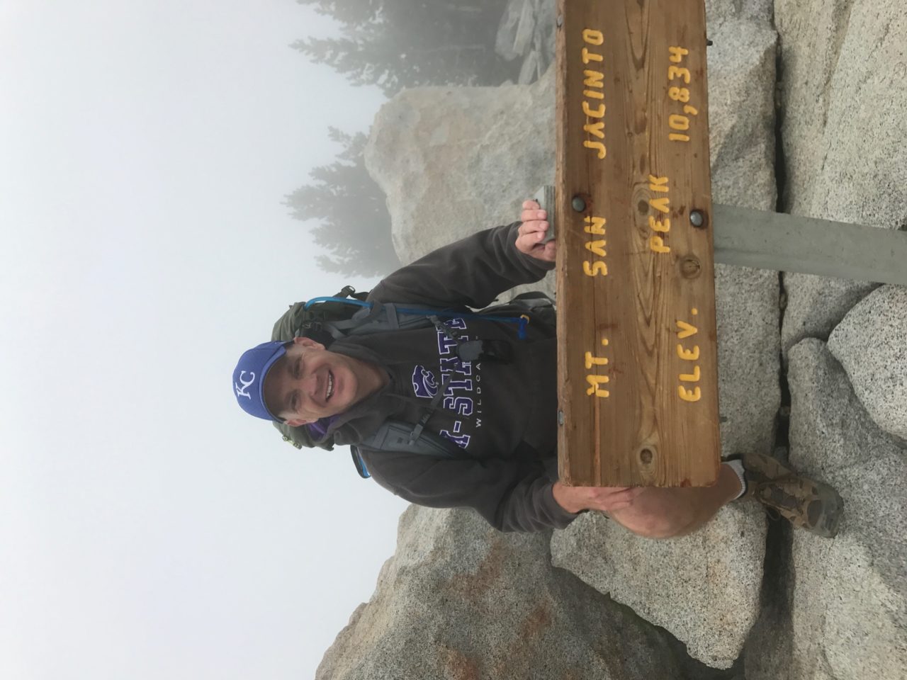 When I got my permit at the ranger station that morning, the ranger was telling us 70% chance of thunderstorms that day, and to turn around as soon as you hear thunder. Ugh… Fortunately, the weather held off, just foggy, cold and windy. The view from Palm Springs showed the peak was in cloud cover.