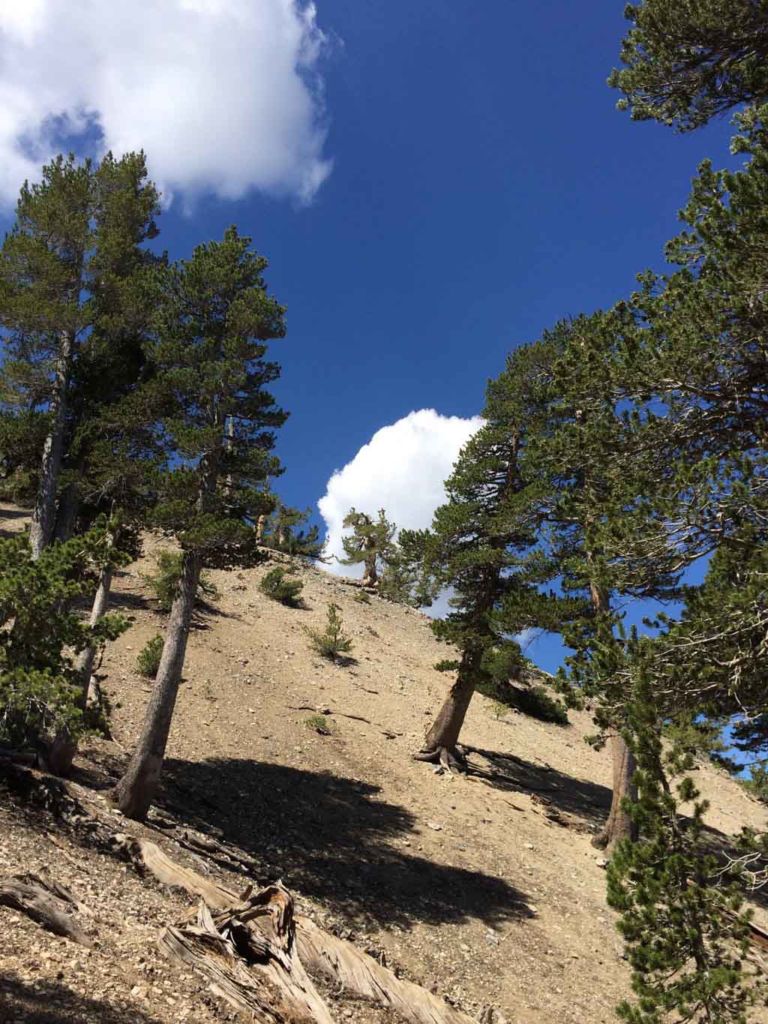 Hiking this trail you can watch the climate zone change as you gain elevation. The thick forest thins out, and closer to the summit are replaced by weathered and twisted limber pines.