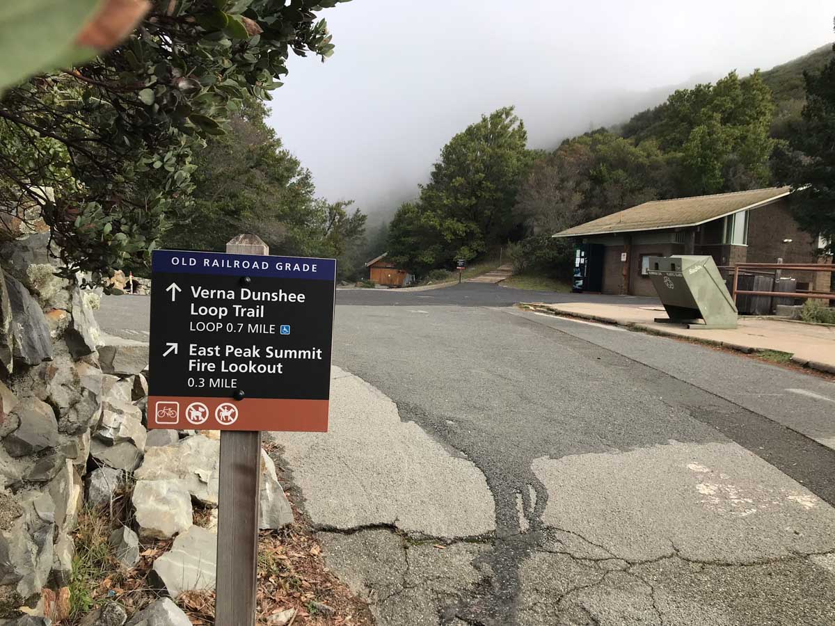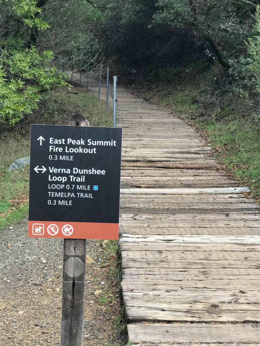 Follow the dirt road left around the front of the West Point Inn and around to the back where it continues the gradual climb up to Mount Tam. You’ll reach a gate and the road to the East Peak parking area. Bear right at the fork and follow to the Plank Walk Trail. This takes you the remainder of the way to the fire lookout tower on the summit of Mount Tamalpais.