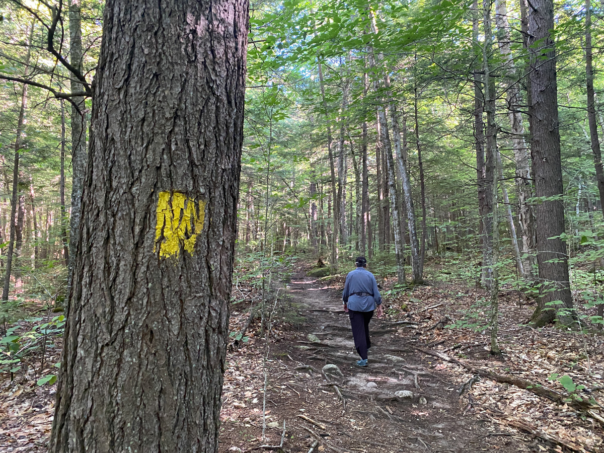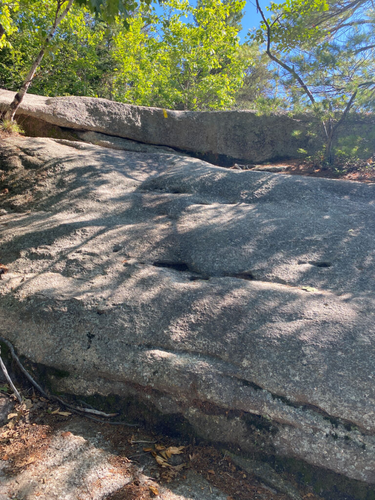 The first mile climbs through well shaded forest on a rocky, root-covered trail. There are yellow blazes on trees to help keep you on the trail. Shortly after the first mile, you reach your first expanse of granite. Take a walk to the ledge and enjoy the view. The exciting part is just ahead.