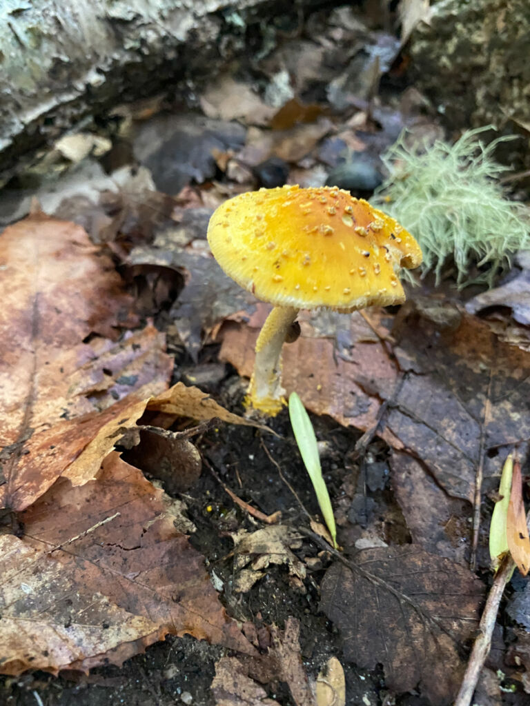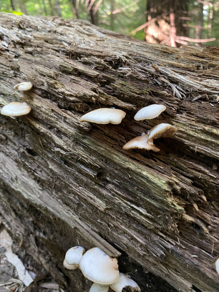 The trail descends along a ridge towards the trailhead, heading due south. Keep your eyes open for mushrooms along the trail.