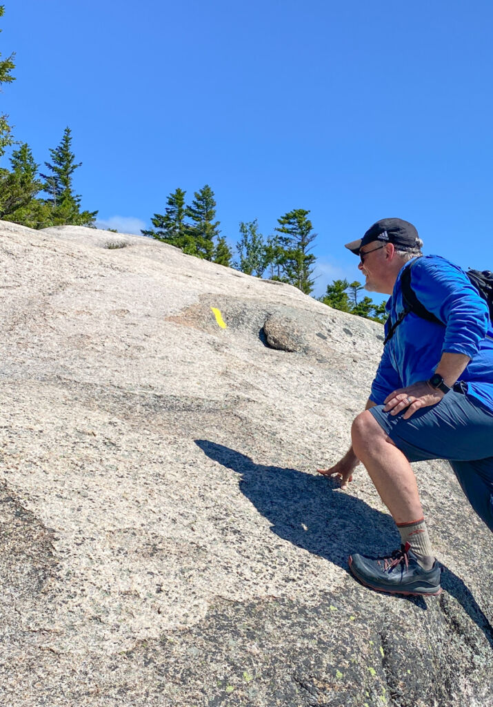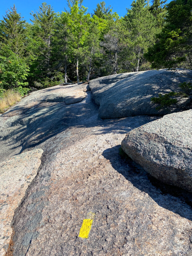 From the viewpoint, the granite slabs get steeper, with some Class 2 scrambling in sections. Follow the yellow blazes, sometimes painted on the granite and other times on the trunks of trees.