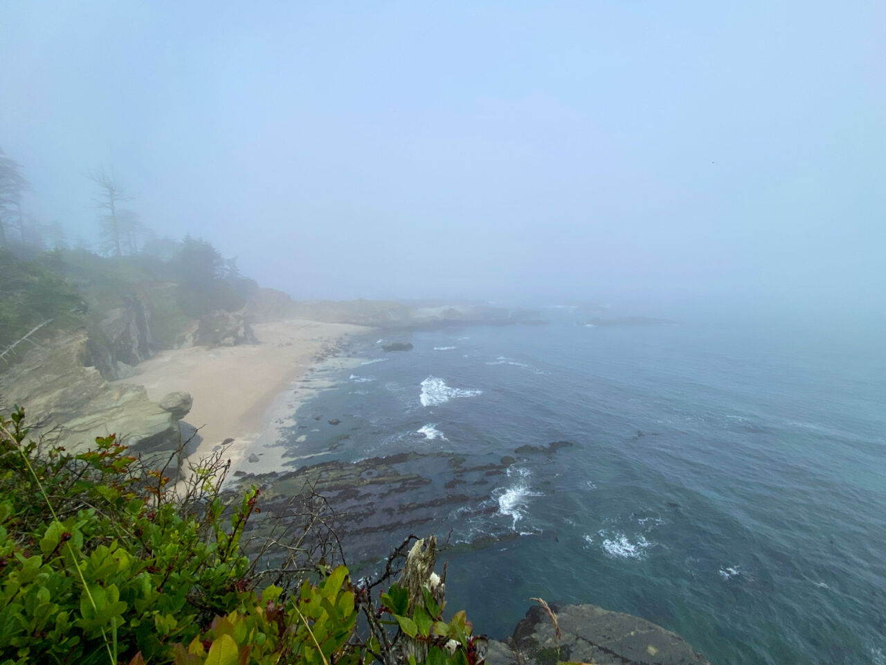 Just before the two mile mark, we reached a spur trail that headed down to a cove. At low tide, it was a great area for exploring. The fog cloaked the beach in mystery.