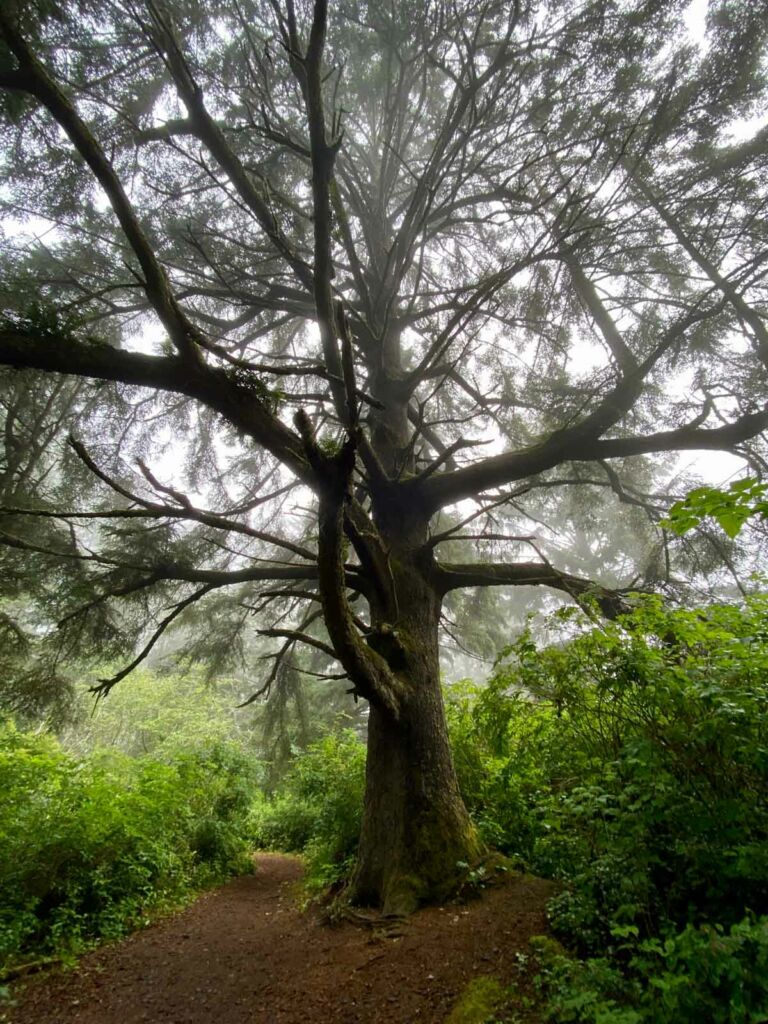This trail generally follows along the coast along the bluff, sometimes ducking into the forest. Look for the trailhead at the south end of the park. It starts by climbing up the bluff. As with much of the Oregon Coast, it can be frequently wet and slick depending on the weather. It’s definitely lush and green. We spied blackberries, deer fern and wintergreen along the trail.